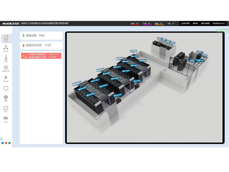 用戶介紹:       該檢察院為江蘇省揚州市境內的司法機關。 解決方案:      近期有幸為江蘇省某市檢察院提供三套安德力士品牌微模塊機房設備,涉及系統有:UPS不間斷電源、精密空調、機柜、配電、動力環境監控等系統;涉及主要設備有:UPS主機(30KVA、40KVA、300KVA)、鉛酸蓄電池(100AH64節、200AH128節、250AH320節)、精密空調(行級25KW12臺、基站12.5KW4臺)、機柜51套,現已全部安裝調試完成。      微模塊數據中心的主要優勢      1、快速部署、縮短建設周期      微模塊數據中心加快規劃與設計速度,可根據設計目標以合理的方式配置系統結構,微模塊批量生產可以實現現貨供應,因而提高了交貨速度;標準化的連接方式可減少現場配置與連接的工作量,加快安裝速度;微模塊數據中心建設周期可大大縮短,傳統數據中心實施階段需要7-8月,采用微模塊建設縮短至2-3個月。      2、方便擴展、分期建設      采用微模塊的架構,數據中心可以逐步增加,因而可使從1個微模塊到幾十個微模塊根據需求分期建設。微模塊數據中心方案顯著降低了數據中心在使用壽命期間的成本。      3、標準模塊、穩定可靠      微模塊數據中心采用模塊化、標準化和高整合設計,使得整個系統穩定度高。同時,微模塊數據中心可依據客戶需求,在電力備援方案上提供N、N+1、2N等配置方案。      4、綠色、節能          數據中心在使用壽命期間的電力成本是TC(總擁有成本)中的一項。相比傳統機房,微模塊數據中心制冷效率提升。微模塊數據中心結合水冷系統、自然冷卻系統,PUE降低。      5、智能管理、高效運營      智能的管理系統能夠幫助客戶節能降耗,實現數據機房多層級、精細化能耗管理,通過多種報表精確定位能源額外損耗點。基于大數據分析,輸出節能優化方案,構建綠色數據機房。資產管理是對于全網資產的生命周期進行管理實現資產信息的閉環管理,保證數據及時刷新,及時管理。同時幫助用戶制定資產維護計劃,在維護計劃內幫助客戶實現主動預警,同時可動態調整維護計劃,按照當前實際情況輸出優化方案,構建資產管理功能。